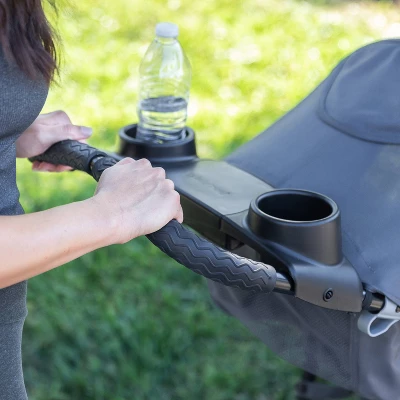 - Convenient parent tray includes two cup holders and covered compartment storage.