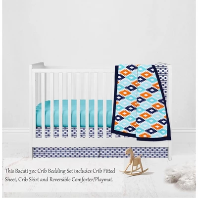 - This Bacati 3-piece Crib Set Includes Reversible Comforter/Playmat (33 x 43 inches), Crib fitted sheet (52 x 28 x 6 inches) and Crib Skirt/Dust ruffle (13 inch drop) in fun, colorful and signature prints in 100 percent cotton 200 Thread Count percale fabrics. Designed in United States by Experienced Designers. Many coordinating items available to purchase separately in this Bacati Aztec Print Liam Aqua Orange Navy Bedding Collection.