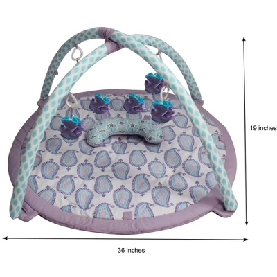 - Ages 0+ – Three ways to play: overhead play, tummy time, playmat – Multiple developmental activities – Bold, high contrast Four hanging toys, – Colorful mat with iridescent toy loops for tummy time – Crescent Moon shaped tummy time pillow for muscle development – Size (inches): 36l x 36w x 20h; (cm): 91l x 91w x 51h