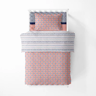 - This Bacati 4-piece Toddler Bedding Set Set Includes Reversible Oversize Comforter (42 x 55 inches), Toddler Bed Fitted Sheet(52 x 28 x 6 inches), Toddler Bed Flat Sheet(52 x 42 inches) which is fitted at the bottom to make the bed easily and Standard Pillow Case (20 x 25 inches) with french ties on the back in fun, colorful and signature prints in 100 percent cotton 200 Thread Count percale fabrics. Designed in United States by Experienced Designers. Many coordinating items available to purchase separately in this Bacati Tribal Print Olivia Coral Navy Bedding Collection.