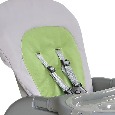 Badger Basket’s extended use Envee II Baby High Chair easily converts back and forth from a fully-featured baby feeding station to a separate play table and chair for your toddler and preschooler! The Envee II’s many, convenient features are easy to use, yet it’s also affordable. Includes a three-position adjustable front tray and three-position, adjustable, reclining seat. Seat can be reclined using one hand. Seat includes a five-point harness system with one-handed, quick release buckle. Simply press the large button in the center of the harness and both shoulder and waist belts release. All belts of the seat harness are fully adjustable for comfort at the shoulders, waist, and crotch. Shoulder belts can be released from the waist belts if needed when adjusting the harness or for removing the harness and pad for cleaning. Two feeding trays included! The large, regular tray has a removable, dishwasher-safe insert tray so it’s easy to tidy-up and always have a clean surface available for each meal. Translucent insert tray snaps off and removes easily by releasing and pulling up on the two side clips. The spacious insert tray includes two indented cup holders and a large indented main compartment (3/4 inch deep). The roomy main tray features one cup holder and one wide indented compartment (5/8 inch deep). Stylish seat pad is removable and washable. Quickly remove the chair from the table by pressing and releasing the large buttons and releasing the leg posts.