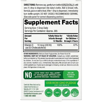 The Sunshine Vitamin for Newborns: Often known as the sunshine vitamin, Vitamin D is an essential nutrient found in various foods, including dairy. For nursing infants, this includes everything from breastfeeding, baby food and formula. However, babies often require additional support to meet their nutritional needs which is why a supplement can help provide them with the nutrients their little bodies crave. Carlyle Lil’ Sprouts D3 Baby Drops: Carlyle Lil’ Sprouts D3 Baby Drops now provides your newborn with the best Vitamin D supplement available to help support their growing bodies. Our formula provides 10 mcg (400IU) of Vitamin D3 per serving in daily concentrated liquid drops. That’s 100% of the daily recommended value for infants up to 12 months old. Our vegetarian formula is gluten free, non-GMO, and easily mixes with breast milk, formula or food! Rooted in Wellness: Our expertise in sourcing the purest ingredients combined with advanced technologies makes us proud to deliver premium, honest supplements at the best value. Carlyle Lil’ Sprouts D3 Baby Drops are a testament to our commitment to excellence, made with powerful ingredients rooted in wellness. Thanks for choosing us in your pursuit of living healthy. WARNING: KEEP OUT OF REACH OF CHILDREN. Consult your child’s pediatrician before administering. This product requires adult supervision and is not to be dispensed by children. Do not use if your child is allergic or sensitive to any of the ingredients. If any adverse reactions occur, immediately stop using this product and consult your child’s pediatrician. If outer seal is damaged or missing, do not use. Store in a cool, dry place. Refrigeration is not required.
