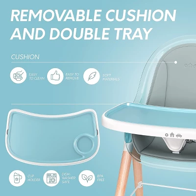 - Full of amazing features, this high chair features a removable double tray, a metal frame for additional stability, an adjustable harness and anti-slip feet.