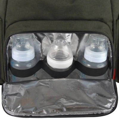 Find what you need when your baby needs it! Clearly labeled pocket system with tabs keeps key items conveniently organized – never lose track of bottles, diapers, wipes. Includes insulated compartment for 3 bottles, side easy closure cell phone pocket, one-handed side Wipes pocket, and more. This forest green diaper bag has a total of 10 roomy pockets for perfect organization for parents and babies