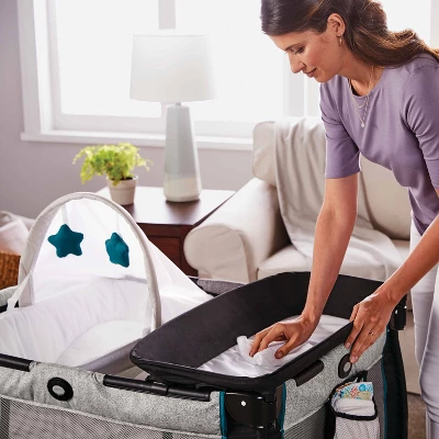 The Graco Pack ‘n Play Care Suite Playard features a cozy Newborn Seat and diaper changer with wipe-clean fabrics to provide both comfort and convenience for you and baby. Care Suite also grows with baby, from comfortable full-size bassinet to spacious toddler playard. This care station has integrated storage for baby’s essentials, a canopy with soft toys, wheels for easy portability, Graco’s signature push-button fold, and a convenient carry bag for easy storage and travel. The Graco Pack ‘n Play Care Suite Playard provides a convenient care station for all of baby’s needs.