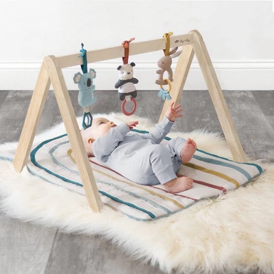 Adventure Awaits! Playtime just got sweeter with the Ritzy Activity Gym from our Bitzy Bespoke collection! Our premium wooden activity gym and quilted rainbow play mat create a comfy and modern play area. Made with a natural cotton fabric, our toys and play mat are extra soft against baby’s skin. The adorable bunny, panda and koala toys entertain baby with textures and sounds, including a jingle and clinking sounds, and they also feature a soft teething ring that is perfect for reaching and grasping. Easily remove the sweet characters to take on-the-go for all of the travels ahead!