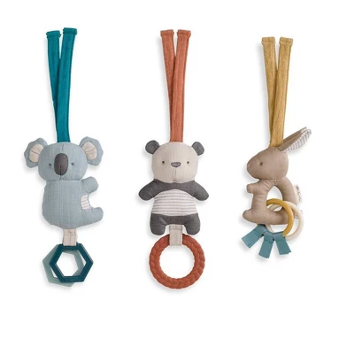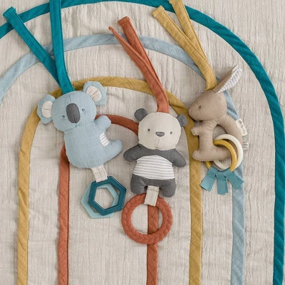 - The included koala, panda and bunny toys feature clinking rings, a soft teether, ribbons and rattle and jingle sounds