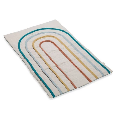 - A natural cotton mat with a rainbow design creates a modern, cozy play space for baby and is soft against baby’s skin