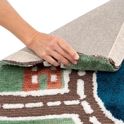 Is it a soft rug, is it a gorgeous play mat, is it a fun interactive car and toy carpet? It is all of the above! These multifunctional, one of a kind play rugs from JumpOff Jo will kick up the fun in your kids’ room or family playroom. Plus it’s extremely soft for crawling babies, tactile for developing toddlers and ripe for imagination in big kids, too. This 3D carpet has recessed roadways for toy cars and other play characters. The design shows elements of a town and neighborhood, trees and houses. The green, tan, blue and brown colors are inspired by nature and their natural setting in an urban neighborhood. This playmat for babies and toddlers stimulates their senses and is soft underfoot. It’s size works as a nursery rug and it’s design can grow with your baby through different milestone developmental, and decor, stages. It’s a great kids rug for a playroom and is also it’s upscale and modern design looks nice in a living room or family room. It’s thick and durable to last through the years and handles kids’ activity and play. Educational, imaginative and colorful, its premium quality will protect floors while your little ones have tons of fun. Materials: Micro polyester pile, 100% polyester. Care: Spot wash with mild soap and water, line dry.