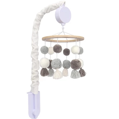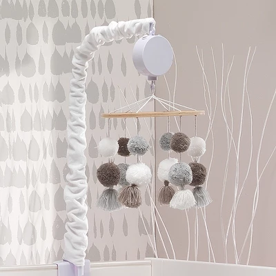 Soft furry pom-poms decorate this charming musical mobile. It has six strings of multiple pom-poms with tassel like trim in earth tone colors which is perfect for boys and girls. The scrunchie which covers the mobile arm is in white velour. This battery operated musical mobile plays nursery songs for 20 minutes, has an on/off switch and volume control. It plays Brahms Lullaby, Twinkle-Twinkle Little Star and Rock-a-Bye Baby. Requires 3 AAA batteries not included.