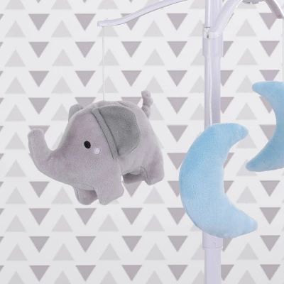 The Elephant Stroll Musical Mobile features two gray elephants and two crescent blue moons. Soothe your baby to sleep with this musical mobile that spins gently to Brahms Lullaby. Includes mobile parts for mounting and easy to follow directions. Coordinates with the Little Love by NoJo Elephant Stroll Bedding Set and Accessories.