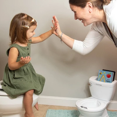 Make potty training easier with the Summer® My Size® Potty Transition Ring & Storage. It features the look and feel of an adult toilet to help ensure a comfortable and confident transition to the real thing. The toilet handle features a flushing sound to reward and encourage your little one. The removable potty topper can be placed onto the adult toilet for a smooth transition. The large built-in storage compartment is 7” wide and spacious enough to hold books, tablets, wipes to promote healthy hygiene habits, and other rewarding items that assist with potty training. This easy to clean potty includes a splash guard and removable bowl.