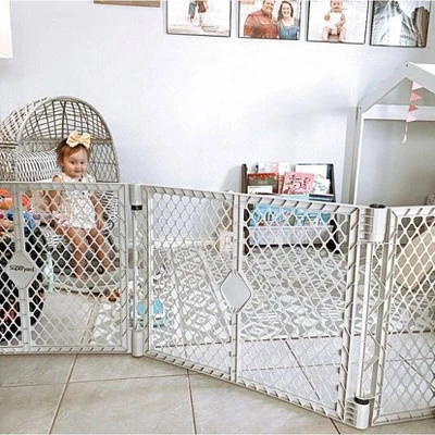 - Six-panel enclosure can act as a barrier or a portable play yard