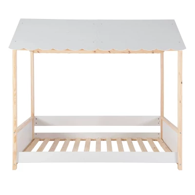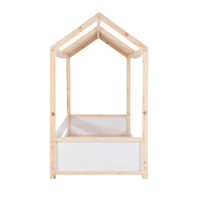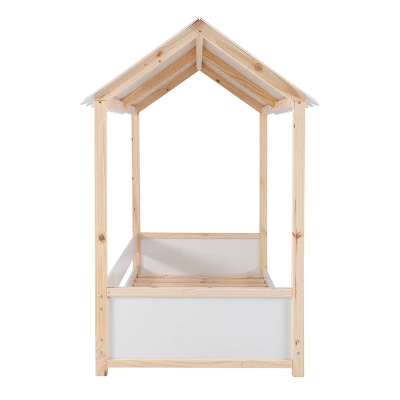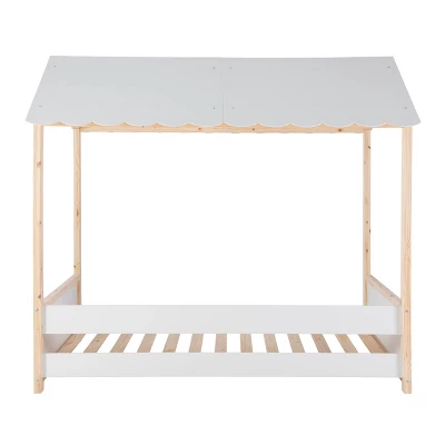 Let your child’s imagination run wild with this charming twin bed frame. With its adorable storybook look, this bed frame is a superb choice for both sleep and play. Unlimited options, you can assemble with a full roof, half roof, or no roof at all. The white finish combined with natural pine accents blend well with any home design. Crafted from solid wood and MDF, this bed frame includes pine slats that alleviate the need for a box spring. Four sturdy pine legs create a safe space for your child to get a good night’s sleep.
